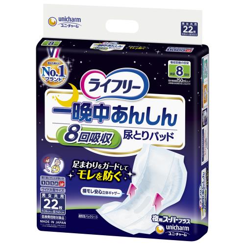 たっぷり8回分をぐんぐん吸収するので、尿量の多い方でも一晩中安心な尿とりパッド。