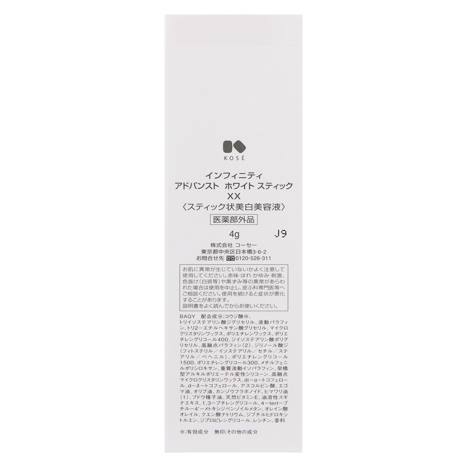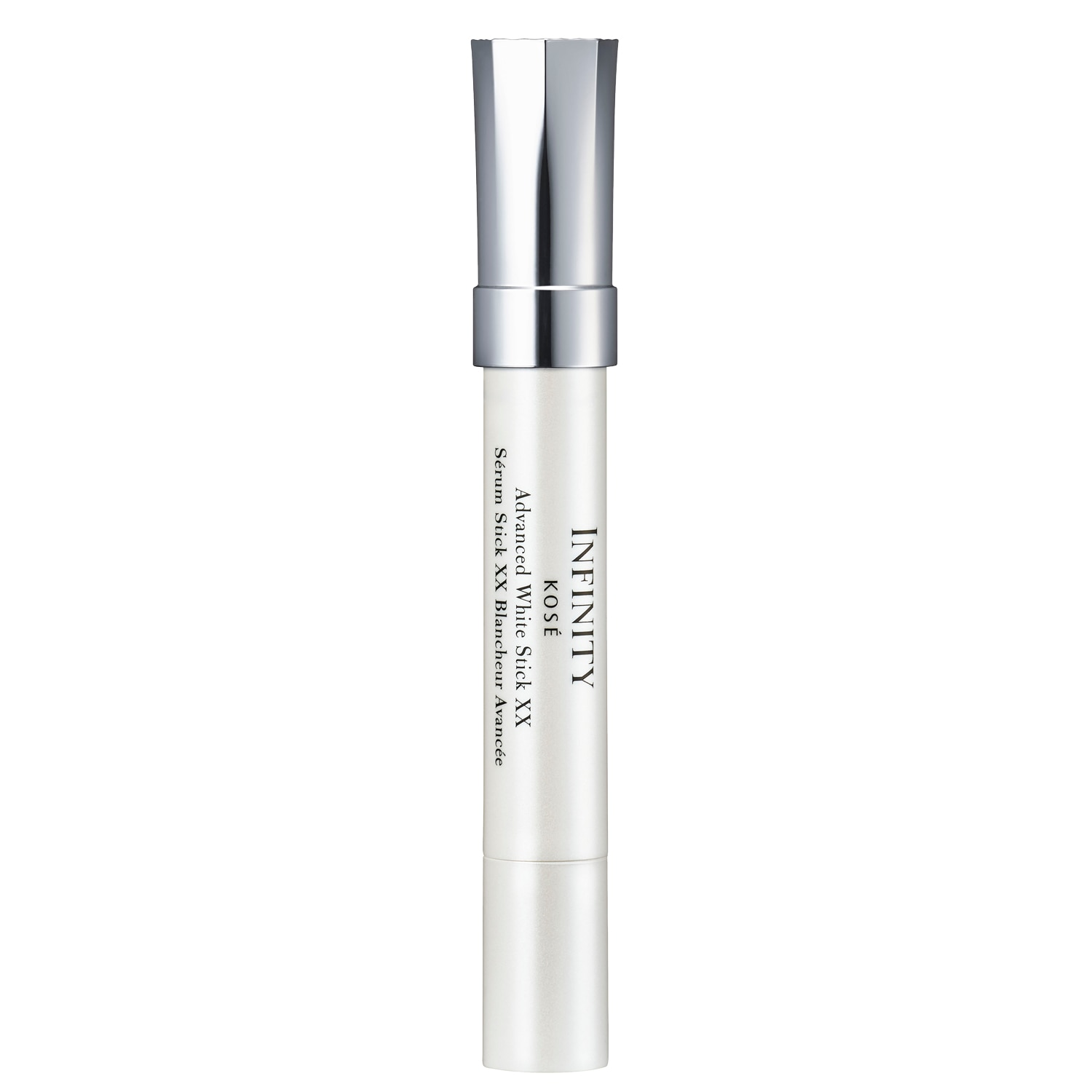 インフィニティ アドバンスト ホワイト スティック XX (スティック状美白美容液) (医薬部外品) : 4g。濃く広がるシミの根源 (メラノサイト (シミのもとをつくる色素生成細胞) ) まで浸透し、美白効果を発揮するコウジ酸配合。狙った一点にしっかりとどまり、ぬけるような白さに満ちた、明るい透明感を叶える、スティックタイプの集中美白美容液です。美白有効成分コウジ酸配合。エモリエント成分 : グレープシード (ブドウ種子) オイル、オリーブオイル、大豆リン脂質 (レシチン) 、オレイン酸誘導体 (オレイン酸オレイル) 、エゴマオイル配合。保湿成分 : 甘草エキス (カンゾウフラボノイド) 、油溶性スギナエキス、ポリエチレングリコール1500配合。メラニンの生成を抑え、シミ、ソバカスを防ぎます。なめらかにのびひろがり、肌にしっかり密着します。心を豊かにうるおす、すがすがしい香りです。