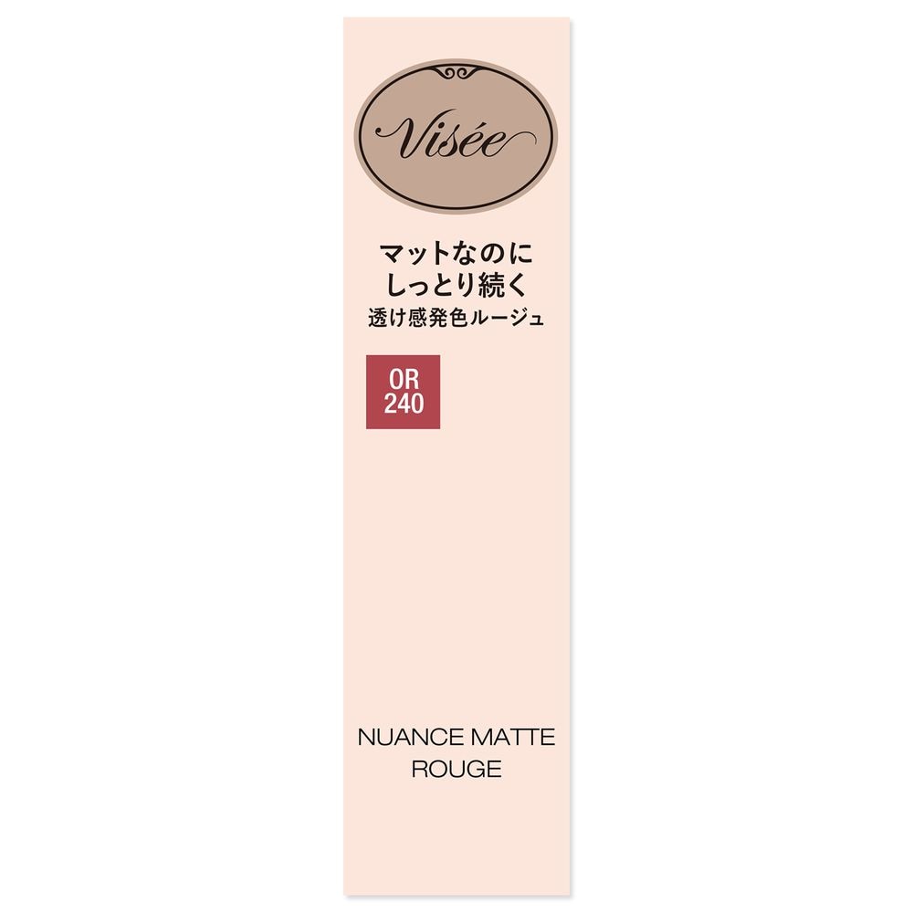 ヴィセ ニュアンス マット ルージュ OR240 (口紅) 4g : OR240 ダスティオレンジ。マットなのにしっとり続く透け感発色ルージュ。ふわっと軽いつけ心地で、マットな質感なのにうるおい続く。ほのかに透けて肌になじむ、ふんわり抜け感リップ。美容液成分 (保湿) (スクワラン) 配合。ソフトスムース成分。唇にうるおいをあたえ、あれ・乾燥を防ぎます。無香料。染料配合。ソフトスムース成分は (ジメチコン/ビニルジメチコン) クロスポリマーです。