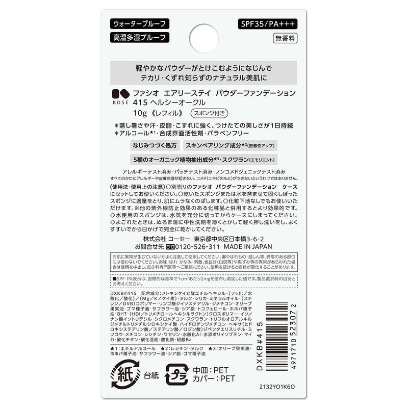 ファシオ エアリーステイ パウダーファンデーション 415 ヘルシーオークル 10g (レフィル) : スポンジ付き。ウォータープルーフ。高温多湿プルーフ。SPF35/PA+++。無香料。軽やかなパウダーがとけこむようになじんでテカリ・くずれ知らずのナチュラル美肌に。蒸し暑さや汗・皮脂・こすれに強く、つけたての美しさが1日持続。アルコール (エチルアルコール) ・合成界面活性剤・パラベンフリー。なじみつづく処方。スキンペアリング成分 (レシチン・タルク) (密着性アップ) 。5種のオーガニック植物抽出成分 (オリーブ果実油・ホホバ種子油・サフラワー油・シア脂・ゴマ種子油) ・スクワラン (エモリエント) 。アレルギーテスト済み・パッチテスト済み・ノンコメドジェニックテスト済み : すべてのかたにアレルギーや皮膚刺激がが起きない、コメド (ニキビのもと) ができないというわけではありません。
