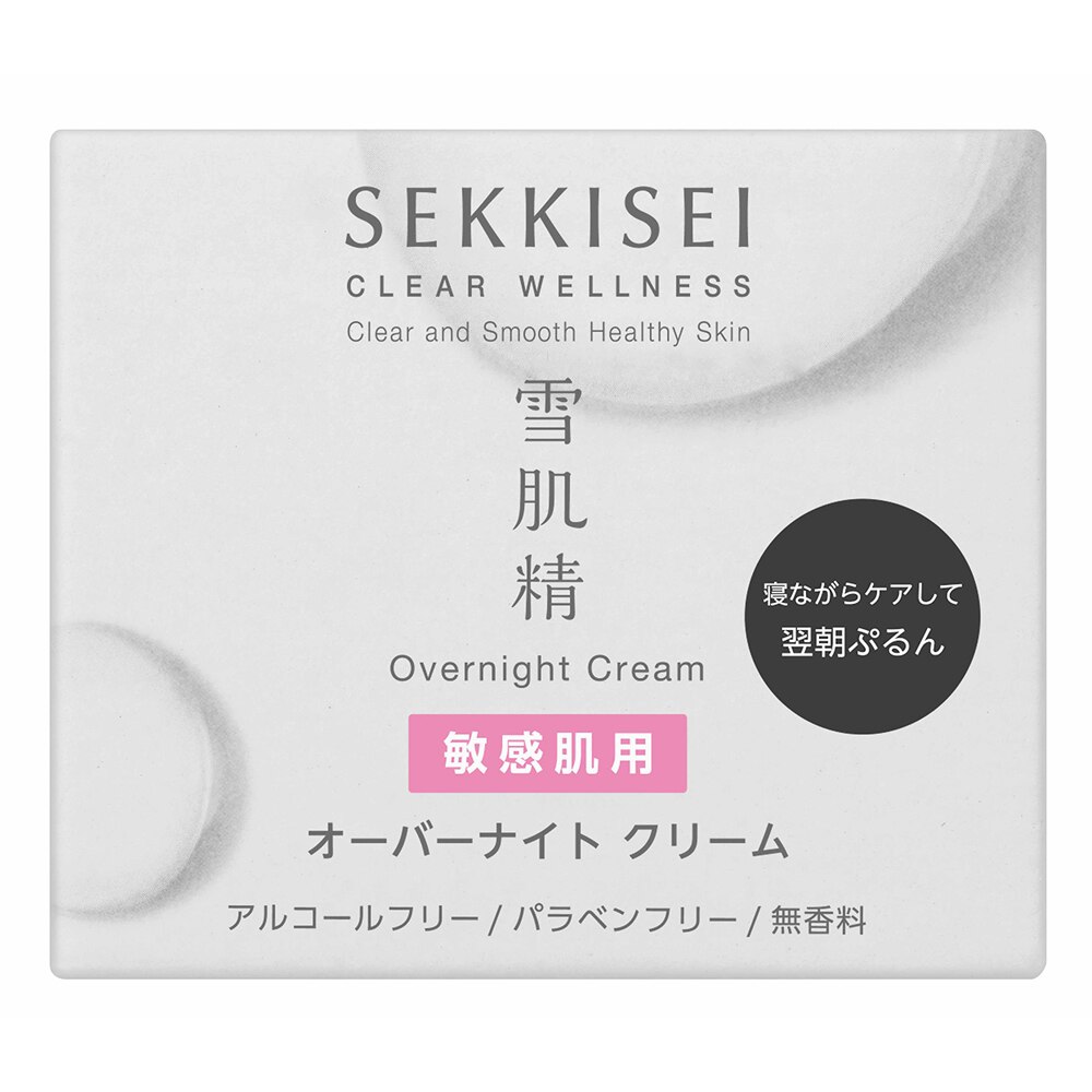 雪肌精 クリアウェルネス オーバーナイト クリーム (敏感肌用クリーム (夜用) ) 40g : 寝ながらケアして翌朝ぷるん。敏感肌用オーバーナイトクリーム。アルコールフリー、パラベンフリー、無香料。肌あれを原因 (乾燥のこと) から防ぎ、透明感、高まる。バームのように濃密なクリームが、水分蒸散をおさえてうるおいバリアをしっかり保護。睡眠中に肌トラブル (肌あれ・乾燥など) を予防し、健やかな肌へみちびきます。高濃度 (当社比) のイトワを配合。アルコール (エチルアルコール) フリー。パラベン (防腐剤) フリー。鉱物油フリー。無香料・無着色。アレルギーテスト済み。敏感肌のかたの協力によるパッチテスト済み。スティンギング (皮膚刺激感) テスト済み。すべてのかたにアレルギーや皮膚刺激が起きない、刺激感がないというわけではありません。イトワ、ハトムギ種子エキス、レモングラスエキス、グリセリン (保湿) 配合。イトワはゲットウ葉エキス・シャクヤク花エキス・ノニ果汁 (ヤエヤマアオキ果汁) ・グリセリン、レモングラスエキスはレモングラス葉/茎エキスです。あなたが美しくなると、地球も美しくなる。雪肌精は、環境に配慮した商品設計をしています。