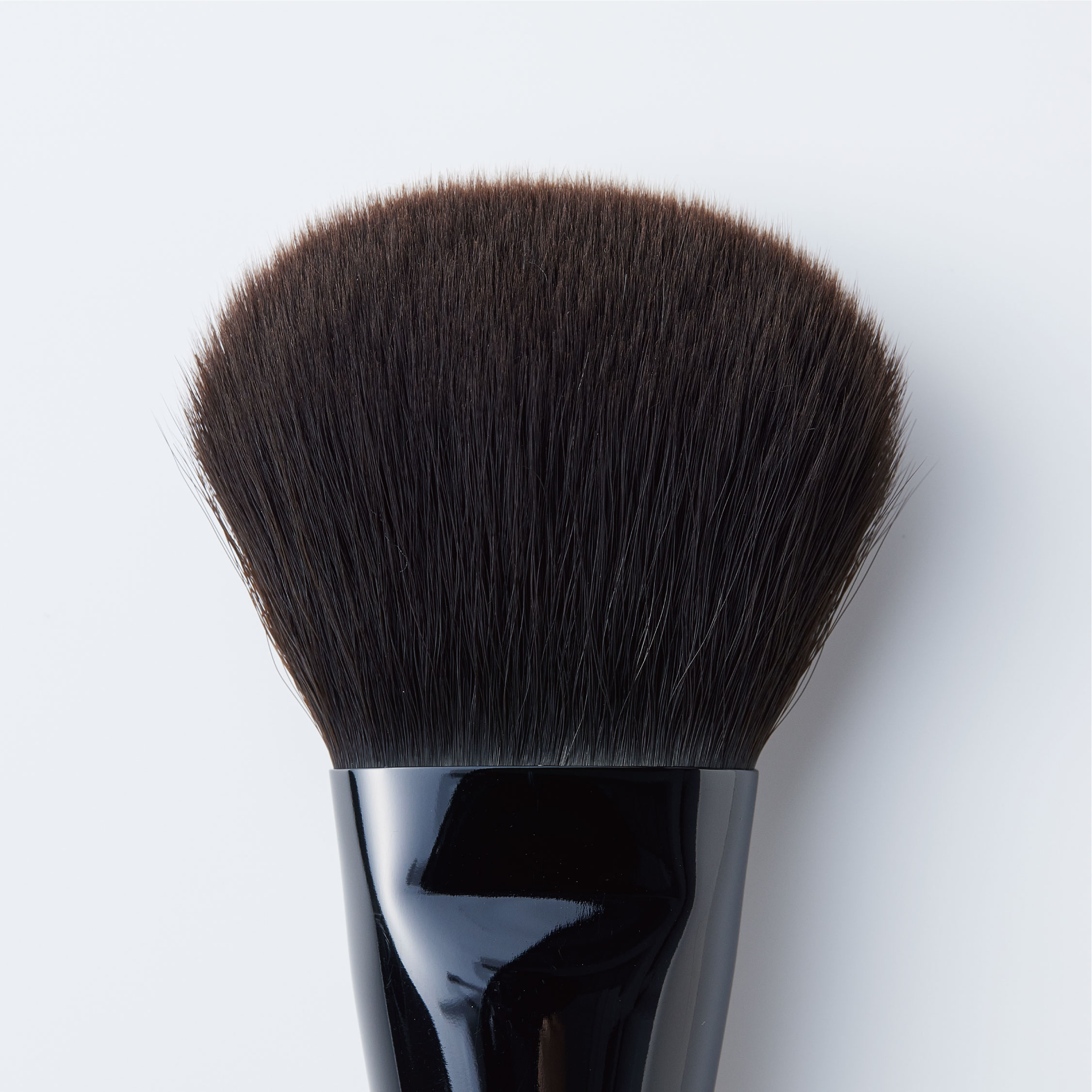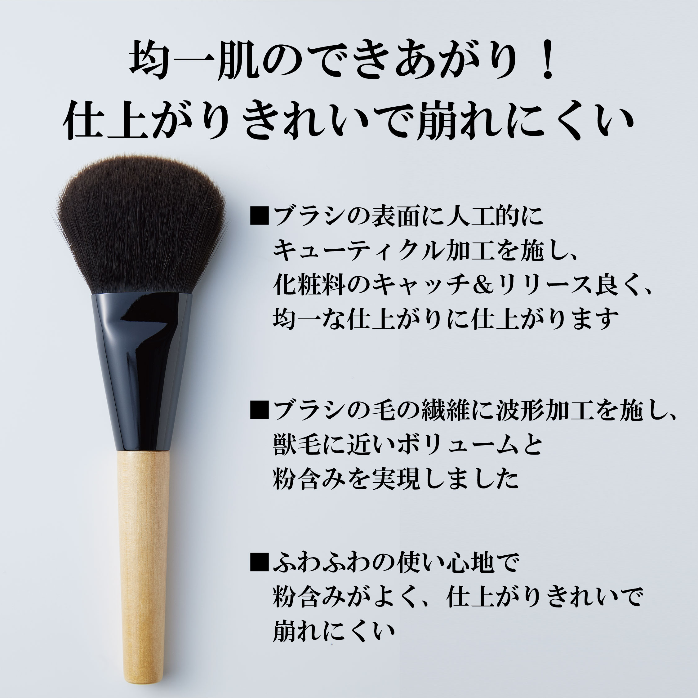 ブラシの毛の繊維表面に人工的にキューティクルのような加工を施し、獣毛と変わらない粉含みを実現しました。化粧料のキャッチ&リリースが良いので、均一な仕上がり、理想の発色に仕上がります。