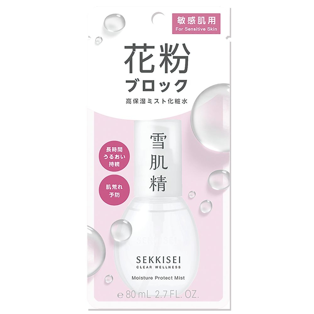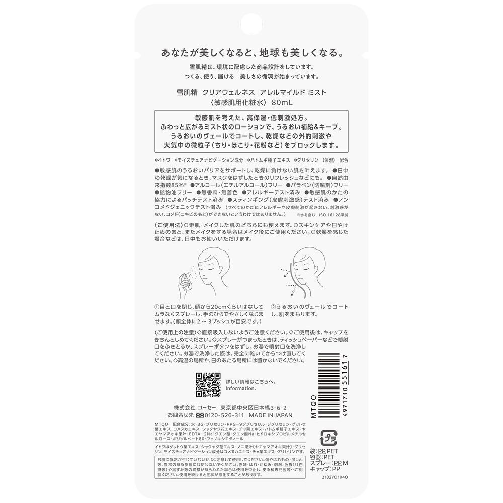雪肌精 クリアウェルネス アレルマイルド ミスト (敏感肌用化粧水) 80mL : 敏感肌を考えた、高保湿・低刺激処方。ふわっと広がるミスト状のローションで、うるおい補給&キープ。うるおいのヴェールでコートし、乾燥などの外的刺激や大気中の微粒子 (ちり・ほこり・花粉など) をブロックします。イトワ、モイスチュアナビゲーション成分、ハトムギ種子エキス、グリセリン (保湿) 配合。敏感肌のうるおいバリアをサポートし、乾燥に負けない肌を叶えます。日中の乾燥が気になるとき、マスクをはずしたときのリフレッシュなどにも。自然由来指数85% (水を含む) 。アルコール (エチルアルコール) フリー。パラベン (防腐剤) フリー。鉱物油フリー。無香料・無着色。アレルギーテスト済み。敏感肌のかたの協力によるパッチテスト済み。スティンギング (皮膚刺激感) テスト済み。ノンコメドジェニックテスト済み (すべてのかたにアレルギーや皮膚刺激が起きない、刺激感がない、コメド (ニキビのもと) ができないというわけではありません。イトワはゲットウ葉エキス、シャクヤク花エキス、ノニ果汁 (ヤエヤマアオキ果汁) 、グリセリン、モイスチュアナビゲーション成分はコメヌカエキス、チャ葉エキス、グリセリンです。あなたが美しくなると、地球も美しくなる。雪肌精は、環境に配慮した商品設計をしています。つくる、使う、届ける、美しさの循環が始まっています。