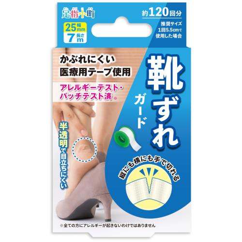 足指小町靴ずれガード(25mmX7M)は靴ずれケアを目的とした製品です。1巻120回分使用できる(推奨サイズ5.5cm使用した場合)医療用テープを使用。靴ずれにならないためには、新しい靴を履いた時やご自分の足サイズに合っていない靴を履いたときなどに靴ずれガードを使いセルフケアを行いましょう。
